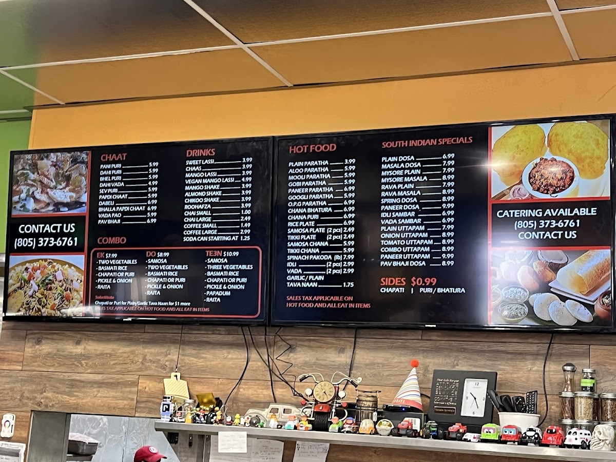 Three vegetables, ( entreé) [ call at restaurant for available options ]. +1 805 373 6761 samosa or aloo tikki. ( choose one ) , basmati rice or flavored rice , (choose. One ) chapati or puri, (choose one ) pickle or onion Chutney and papad